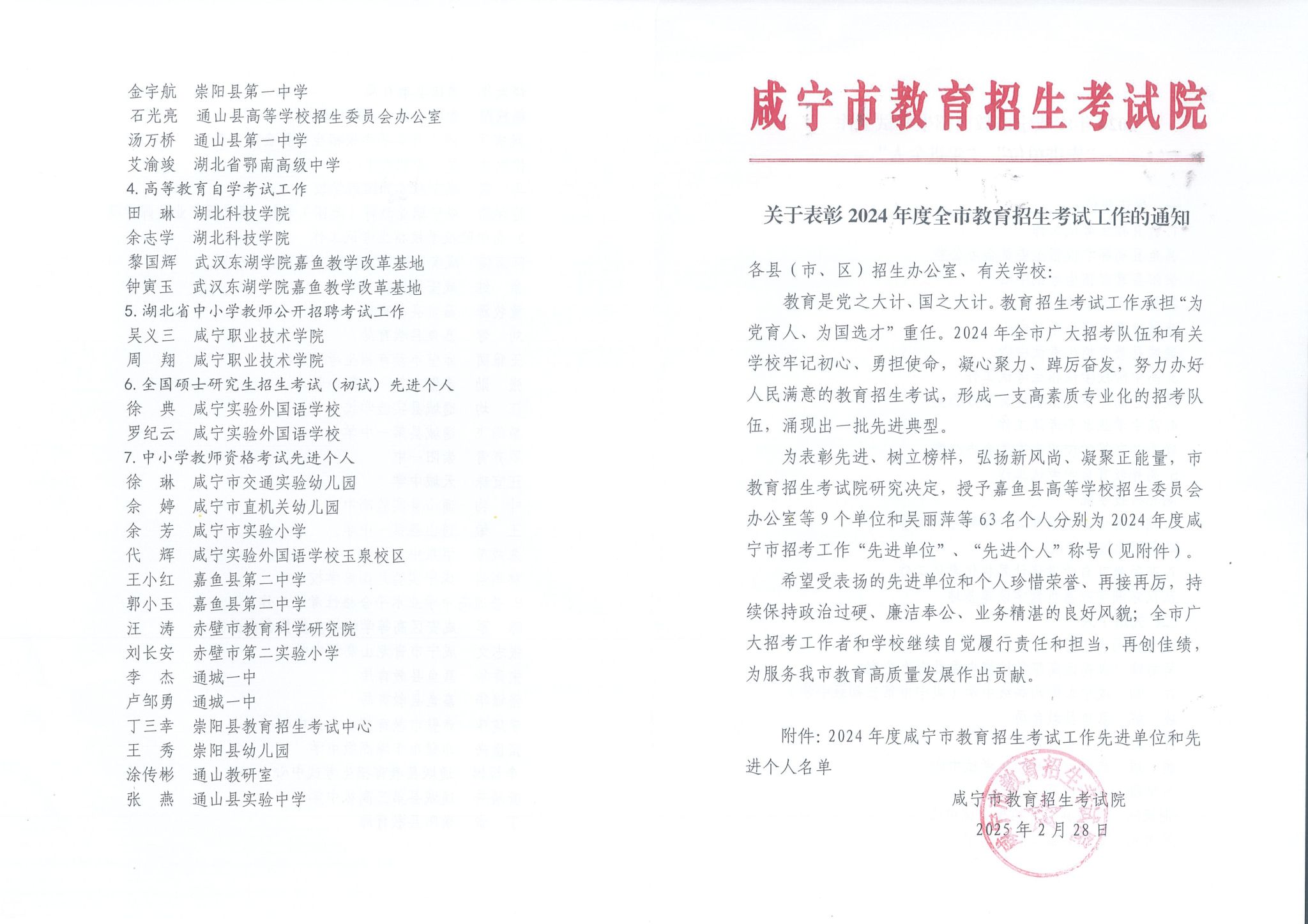 近日,咸宁市招生考试办公室公布了《关于咸宁市2024年度教育招生考试工作及个人评价结果的通报》。我校凭借规范的管理、优质的服务和良好的考风考纪,获评市教育招生考试优秀考点,极品少妇自慰泬自慰吴义三、周翔同志获评优秀考务工作者。